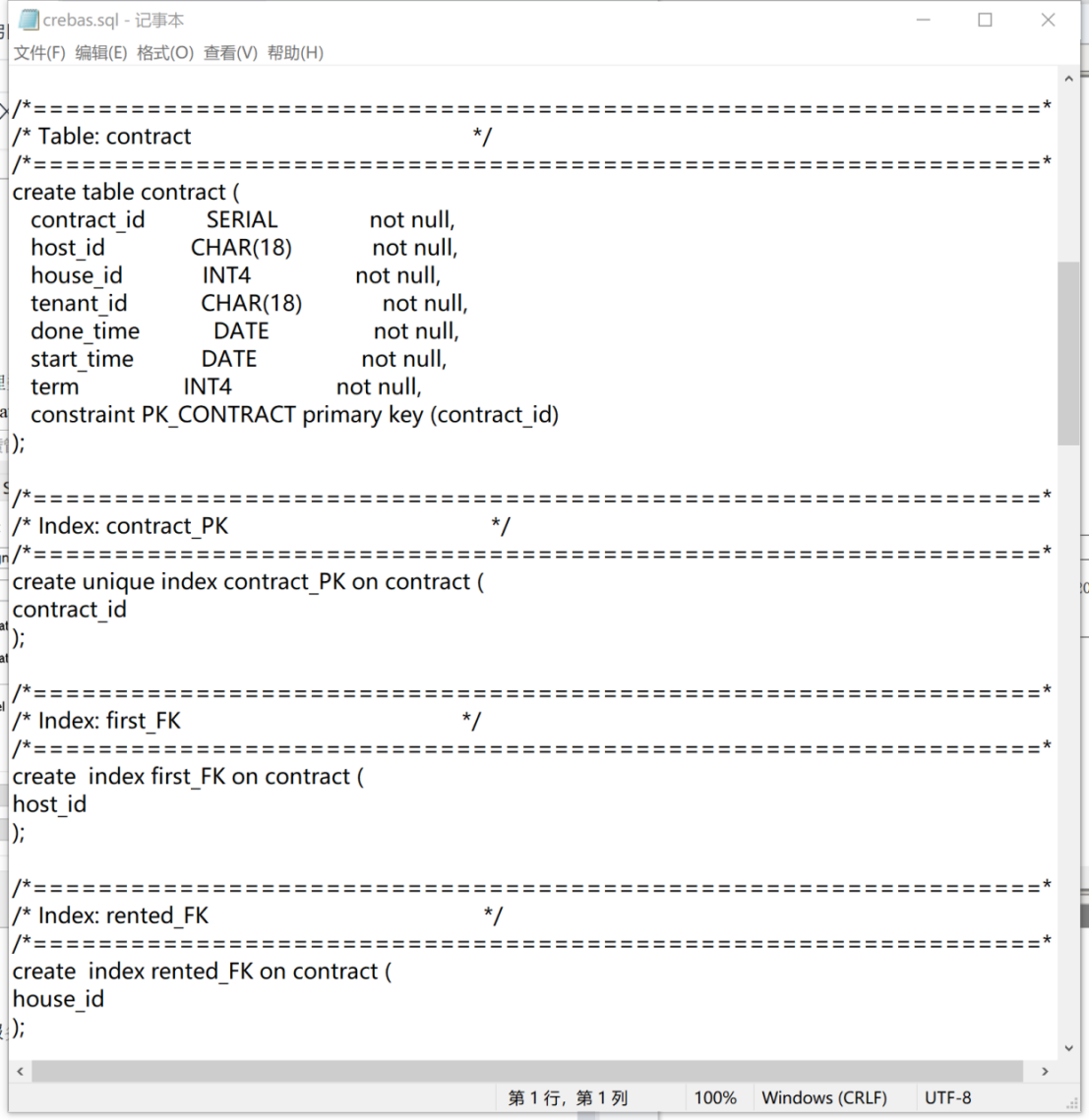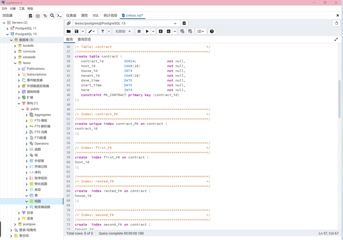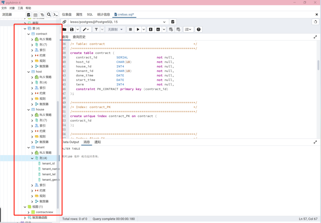 - 在PostgreSQL数据库服务器中,执行该SQL脚本程序,实现房屋租赁管理系统数据库对象创建实现。