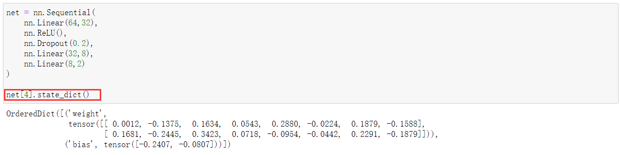 net = nn.Sequential( nn.Linear(64,32), nn.ReLU(), nn.Dropout(0.2), nn.Linear(32,8), nn.Linear(8,2) ) net[4].state_dict()