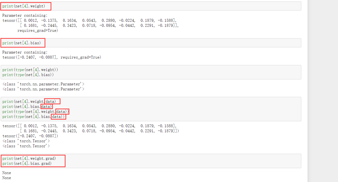 可以看到,改了net[2]的参数值后,net[2]和net[4]的参数值依然是相等的。实际上,它们是指向同一个parameter对象的,所以改了一个,另一个也会变。