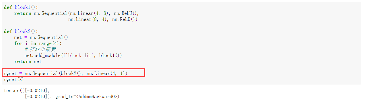 当使用nn.Sequential类创建模型时,我们可以通过索引来访问模型的任意层。我们首先创建一个nn.Sequential: