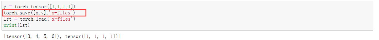 torch.save的第一个参数是要保存的张量,第二个参数是要保存成为的文件名。注意,上面的代码中我们先创建张量x = [1,2,3,4],将其保存为文件x-file,此时x-file已存在。而我们再将新的x = [3,4,5,6]保存为x-file,便将x-file的内容覆盖了,再读取x-file并打印它,可以看到它的值是[3,4,5,6]了。