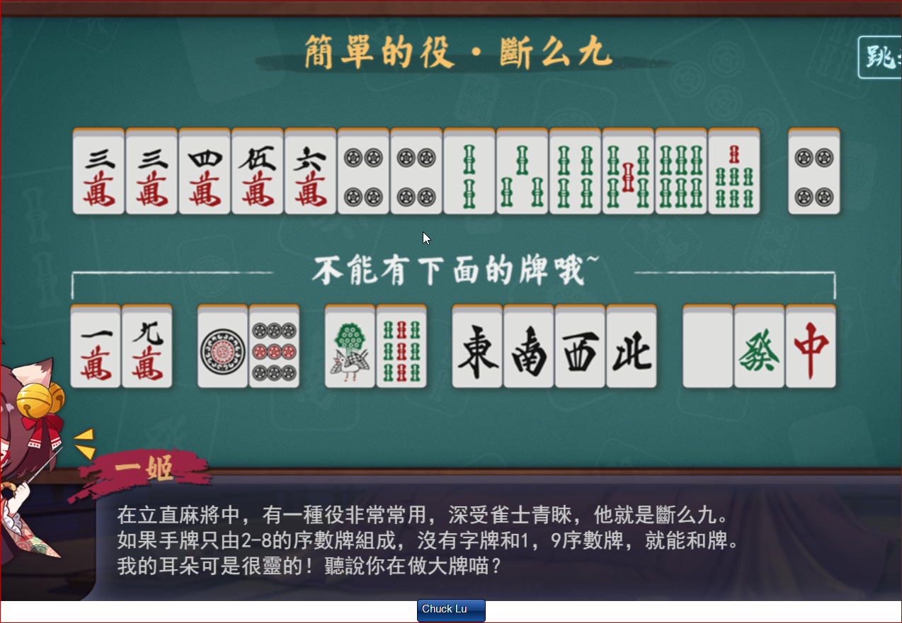 举例来说,以下是一个满足断幺九役的手牌例子: 2万 3万 4万 5万 6万 7万 8万 2筒 3筒 4筒 5筒 6筒 7筒 8筒