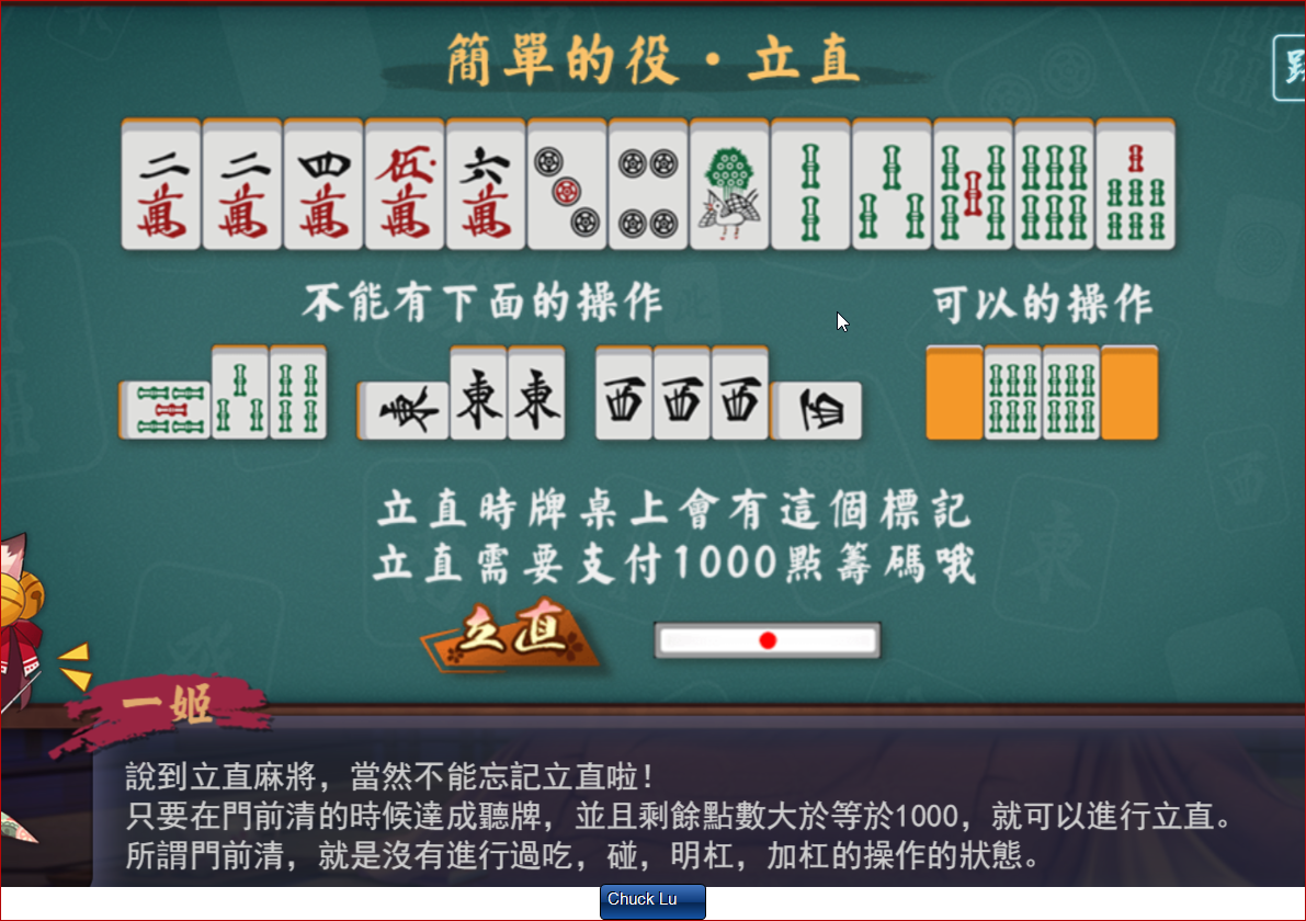 - 未进行过吃、碰、杠:玩家在宣告立直前不能进行过吃、碰、明杠或暗杠的操作。