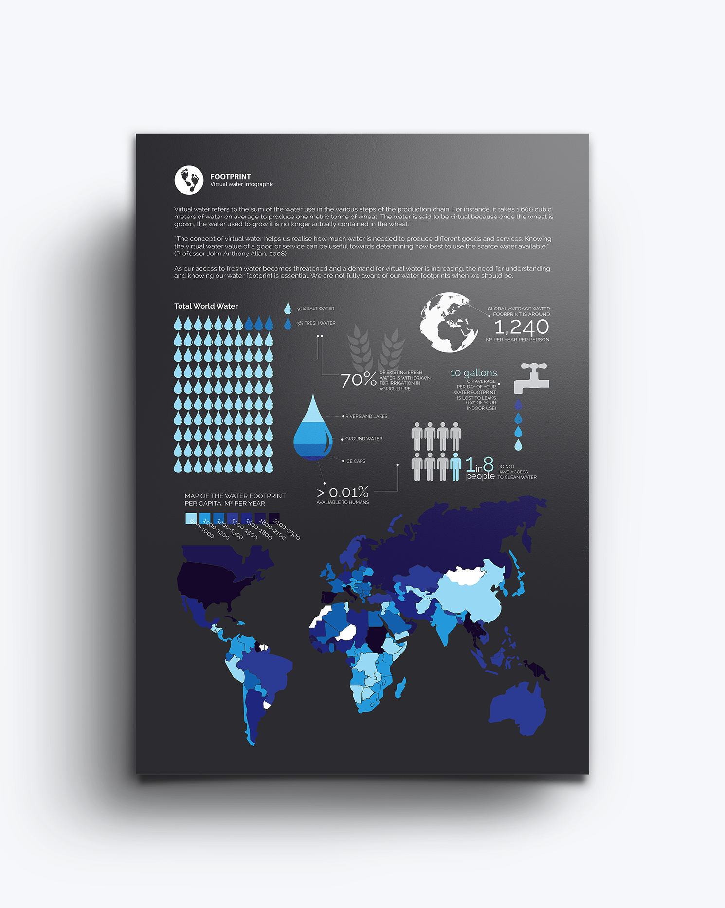 从巧克力到奶酪、咖啡和啤酒,每种产品都需要一定量的淡水才能生长或生产。信息图的第二部分以可用的水资源为中心,包括每年人均水足迹地图和人们可获得的清洁水的一般情况。