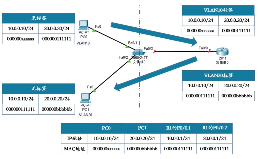 以上图为例,PC0需要发送数据给PC1,发现PC1和自己不是同一个网段,这时将数据交给自己的网关,网关为路由器0的F0/0.1子接口,通过ARP协议获取自己网关的MAC地址,数据会通过交换机进行转发,到了交换机之后,会为收到的数据打上vlan标签10,将数据传到路由器0,路由器0收到数据,集合路由器的工作原理,查看目的IP地址,找到对应接口,再进行标签转换,再发送到交换机,这时交换机收到的就是打上vlan20标签数据,根据交换的mac地址表的对应关系直接转发