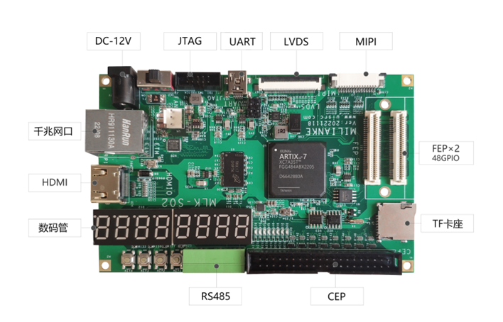 MLK-S02开发平台主芯片搭载了一颗XILINX的XC7A35T-2FFG484I、XC7A100T-2FFG484I。芯片封装是 FGG484,速度等级是 2,温度等级是工业级。