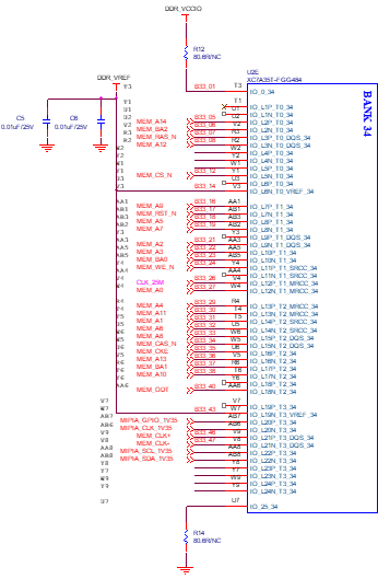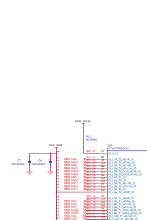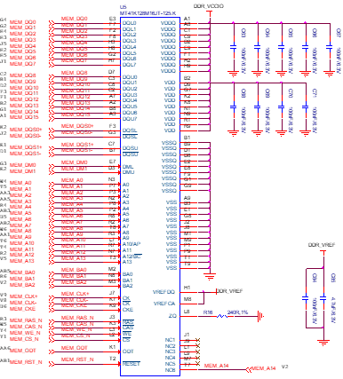 DDR的芯片型号为MT41K128M16JT-125:K,其内存大小是 256MB ,由Micron生产。开发板采用高速布线,DDR3 的硬件设计需要严格考虑信号完整性,开发板的电路及PCB 设计已经充分考虑了匹配电阻/终端电阻,走线阻抗控制,走线等长控制,以确保DDR3稳定工作。