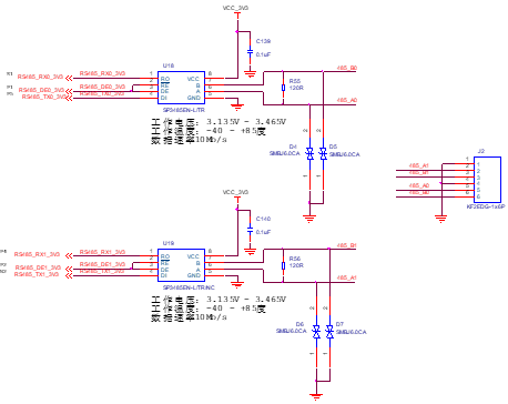 开发平台具有两路485通信(空贴一路),其芯片型号为SP3485EN-L,供电电压3.3V,可以与5V逻辑互操作。以下为部分原理图: