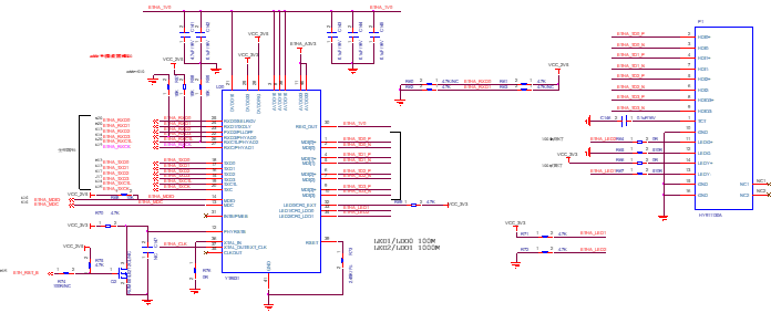 开发平台具有一路以太网,其以太网芯片型号为YT8531,其芯片IO电压为2V5,其收发线按照差分走线处理,控制线及时钟线按照等长处理。