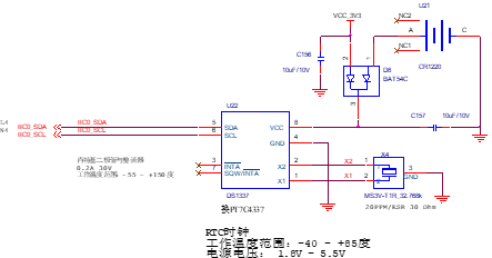 开发平台具有一颗RTC时钟,芯片型号为PT7C4337,芯片支持I2C-Bus高速模式,工作电压范围为1.8V-5.5V。
