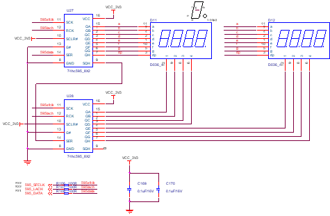 开发平台具有2个共阳极4位数码管,由两个74HC595驱动。