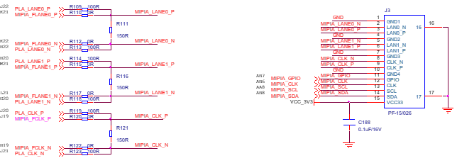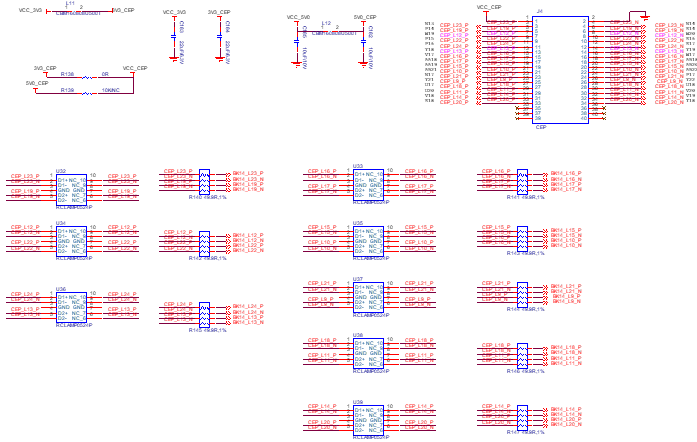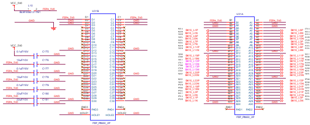 开发平台焊接有一对FEP连接器,原理图接入有48个IO/24对差分,接入5V电源。
