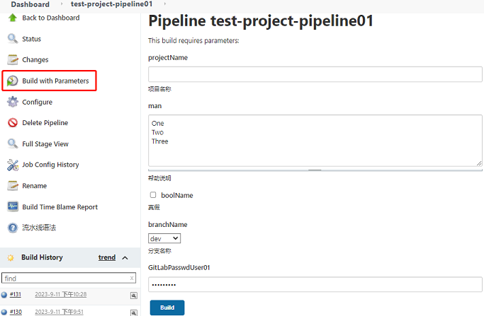 - 在Jenkins新增参数后,至少要手动执行一次,它才会被Jenkins加载生效。生效后,在执行项目时,就可以设置参数值了,如图所示。