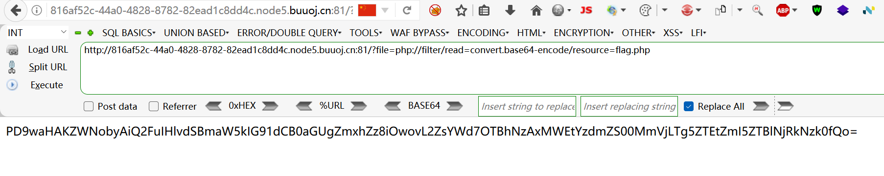 看题目可以知道这是一个文件包含的漏洞,构建payload:?file=php://filter/read=convert.base64-encode/resource=flag.php,得到