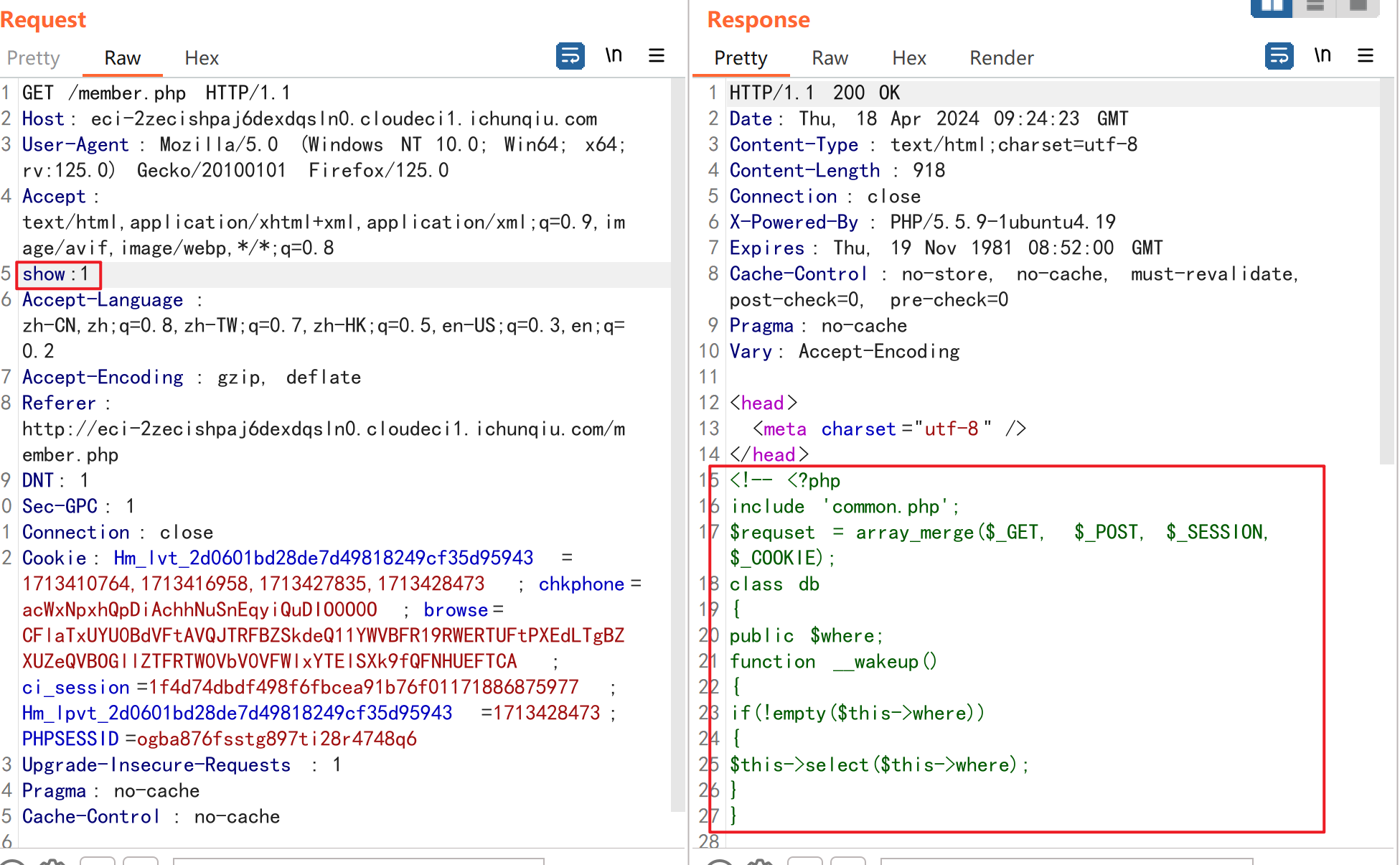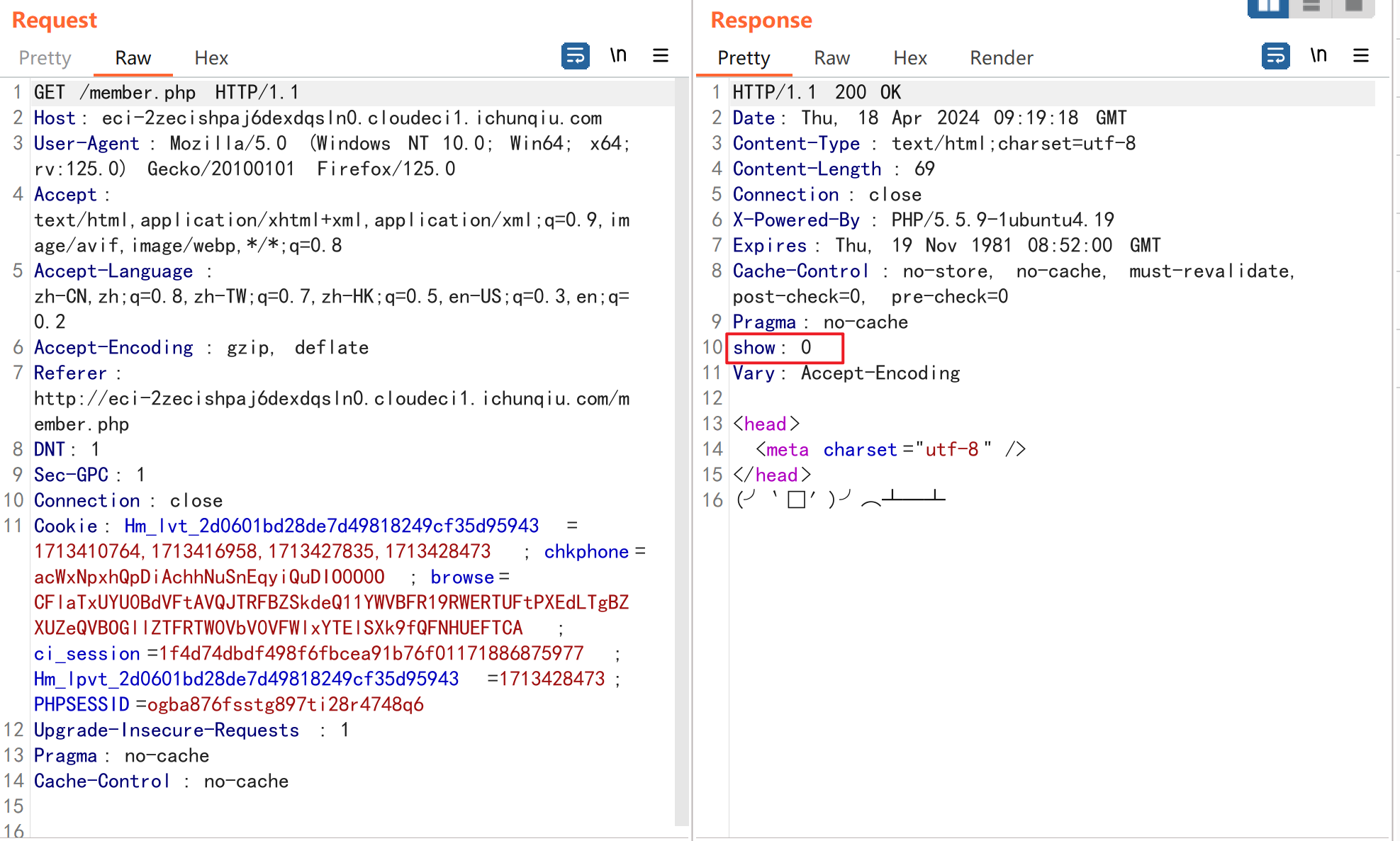 总结:这个比较迷惑的是开始的登陆界面,让人觉得是SQL注入,还有网页源码的中的给出的用户名和密码,多用bp抓包,注意看Response响应头里面有没有什么特殊的地方,比如这里的show:0
