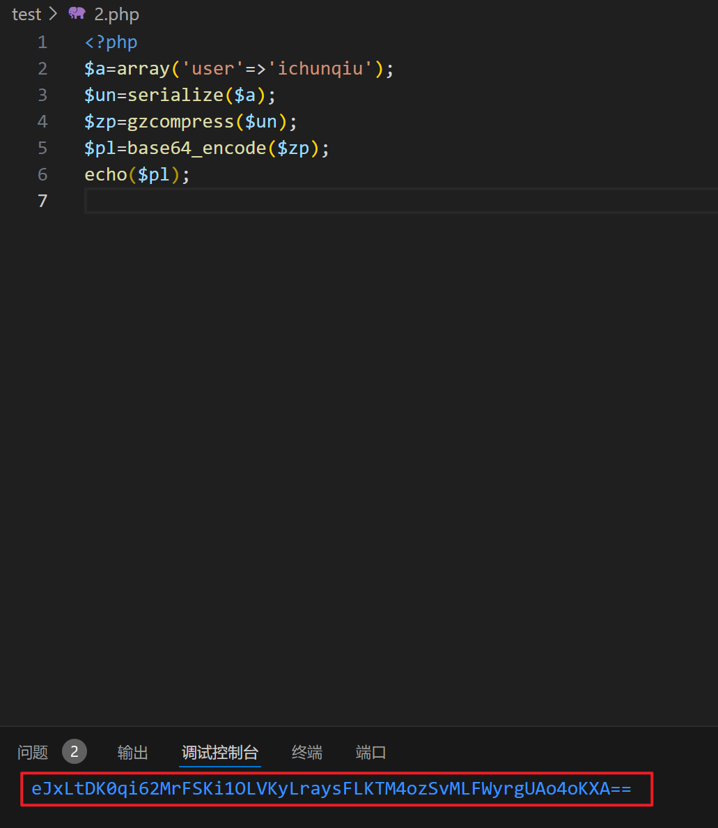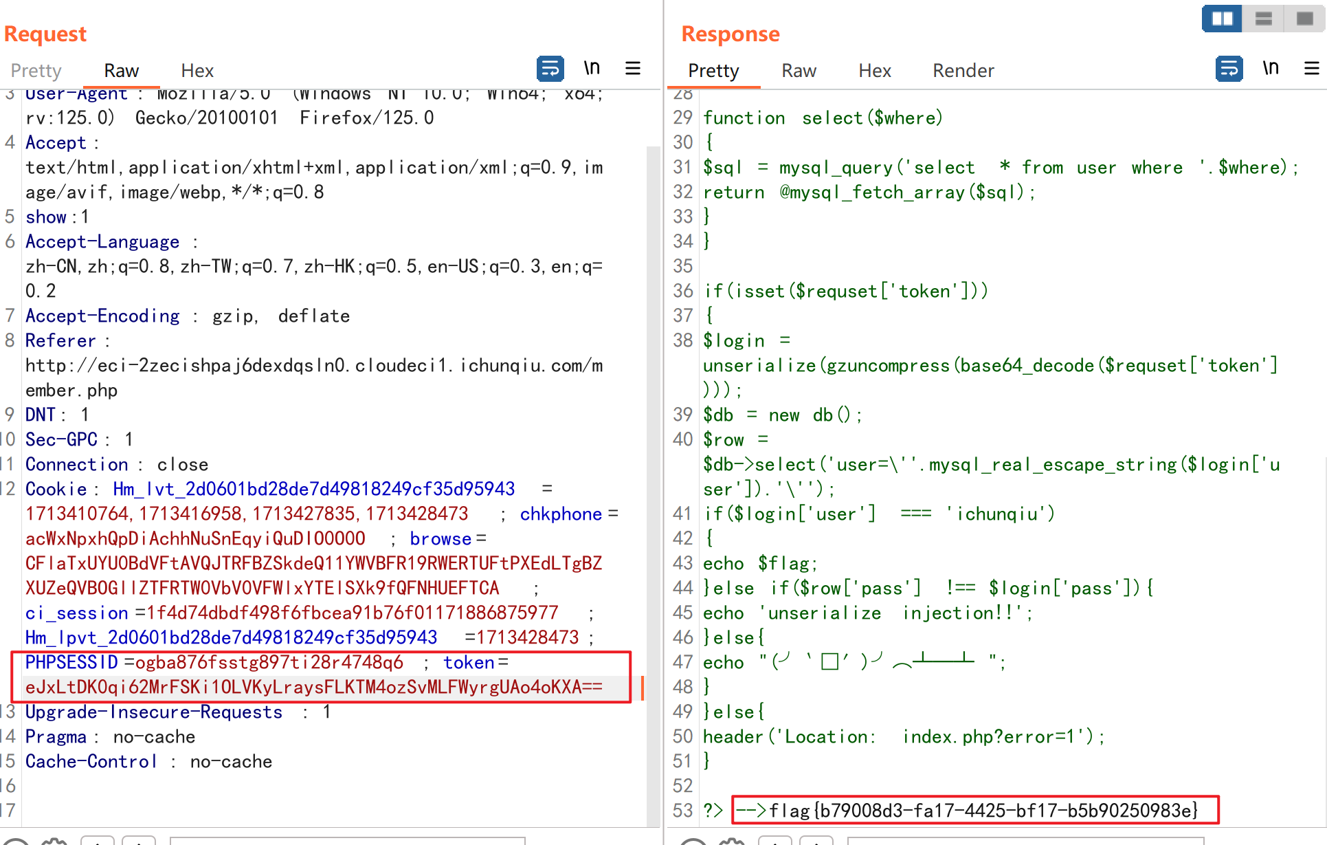 现在就是审计这段php源码,审计完后我们知道只要让login中的user等于ichunqiu就会输出flag,然后这里我们要构造token的值,这里的token的值是经过base64,解压缩,反序列化后的结果: