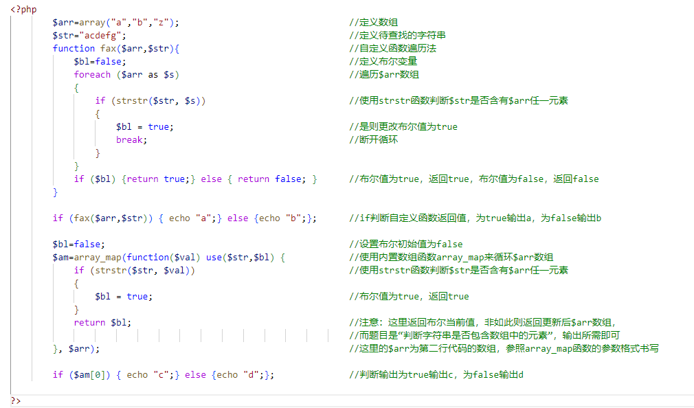 方法一:循环数组,使用strstr函数判断其中元素是否被包含在字符串中,有则退出循环,输出true,没则循环到底,输出false。亮点是代码直观,遇到true就退出循环,用时至少,就是敲的代码多了一丁点。