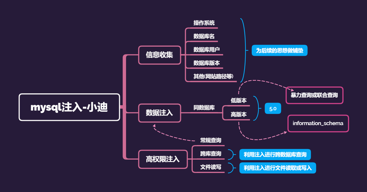1. 在MySQL 5.0以上版本中,mysql存在一个自带的数据库名为information_schema,它是一个存储所有数据库名,表名,列名的数据库,也相当于可以通过它查询获取制定数据库下面的表名或者列名信息。