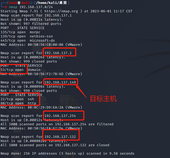 2.nmap命令扫描所在网络断的ip即开放端口 nmap 192.168.137.0/24