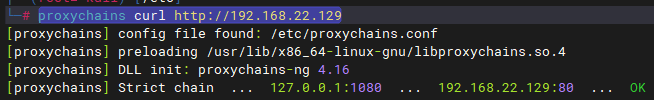 配置proxychains.conf socks5 127.0.0.1 1080 验证代理是否成功 proxychains curl http://192.168.22.129