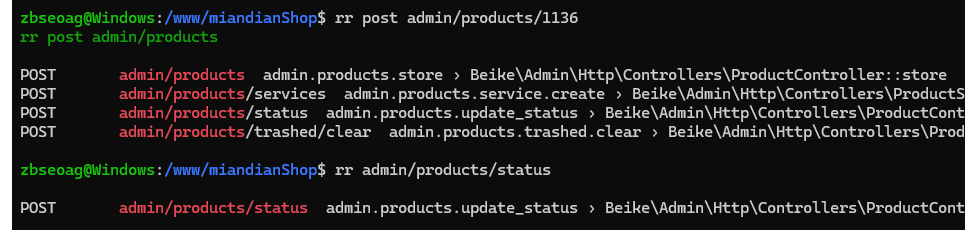php artisan route:list $options | head -n -2 | sed -E "s/@/::/; s/\.+/ /; s/\s+/ /" | grep -P "\s$kwd"