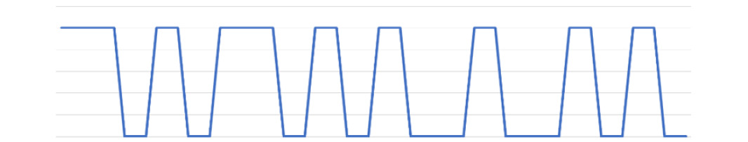 脉宽调制(PWM Pulse Width Modulation)引脚输出循环数字波形,下图也显示了随时间变化的电压,但脉冲的定时代表了连续电平,因此虚线显示的是定时产生的连续电平。PWM输出允许代码选择频率和导通时间。在一个周期内,接通时间与断开时间的长短会发生变化,从而改变输出信号。这通常用于控制电机的速度: