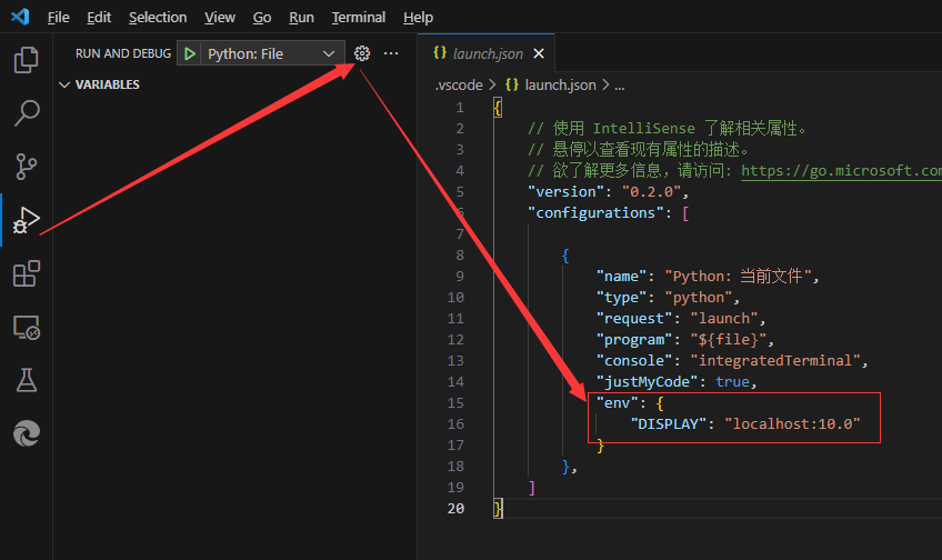在debug 中 点击设置 按钮,出现 launch.json 添加 json 配置 ,如下图