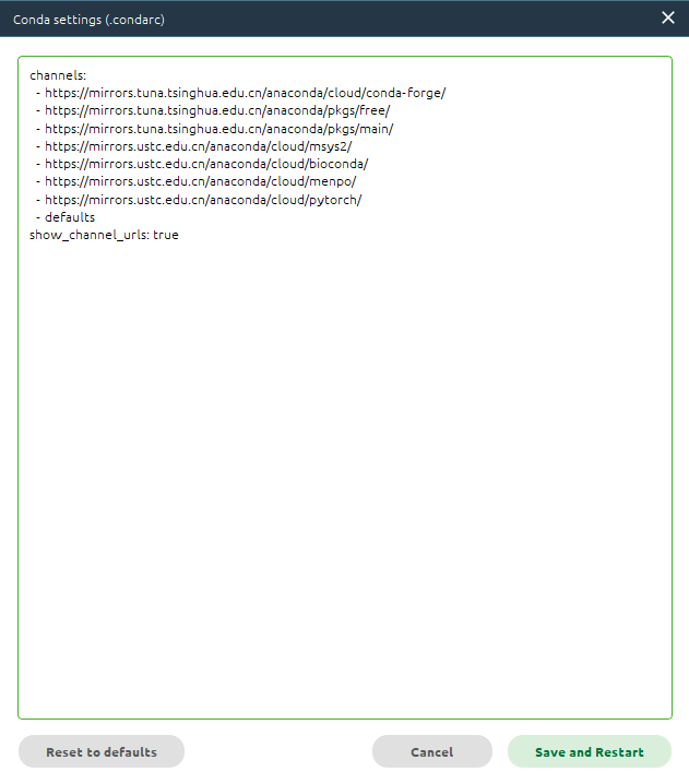 在首选项对话框中点击《Config Conda》按钮,打开Conda配置对话框,如图7,在该对话框中编辑配置国内镜像资源地址,配置完成后点击按钮《Save and Restart》按钮保存配置内容并重启Anaconda软件就完成配置了。清华、中科大镜像地址配置的例子如下: