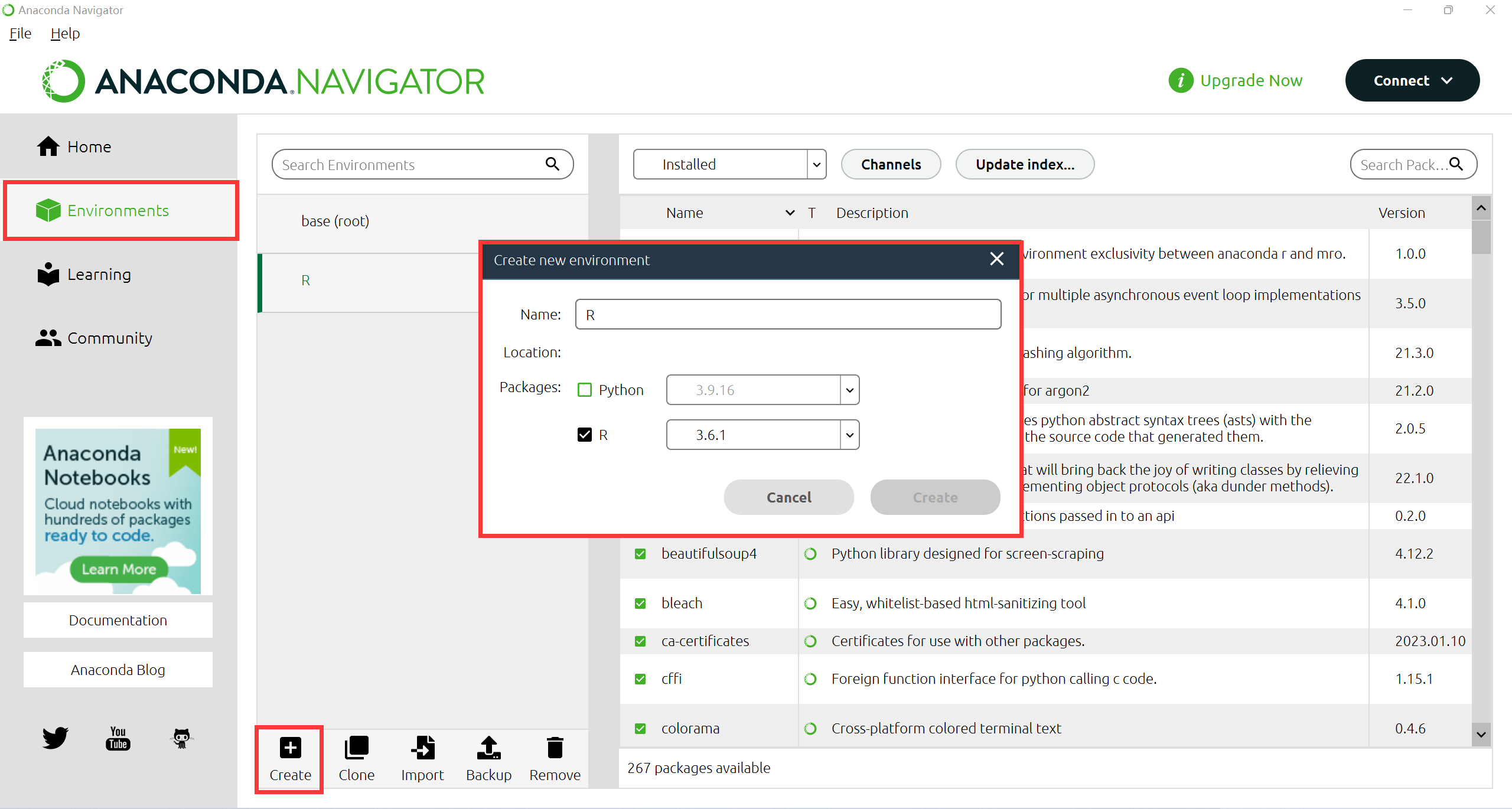 选择“Environments”,点击“Anaconda”会要求你创建一个新的环境,可以改名为“R”,“python”可以勾选也可以不勾选,然后就开始等待(我这里是已经下载完了)。