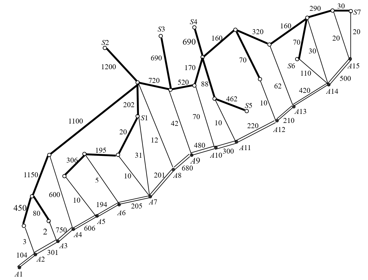 要铺设一条\(A_1→A_2→…→A_{15}\)的输送天然气的主管道,如图所示。经筛选后可以生产这种主管道钢管的钢厂有\(S_1 ,S_2,…,S_7\)。图中粗线表示铁路,单细线表示公路,双细线表示要铺设的管道(假设沿管道或者原有公路,或者建有施工公路),圆圈表示火车站,每段铁路、公路和管道旁的阿拉伯数字表示里程(单位:km)。为方便计算, 1km主管道钢管称为1单位钢管。