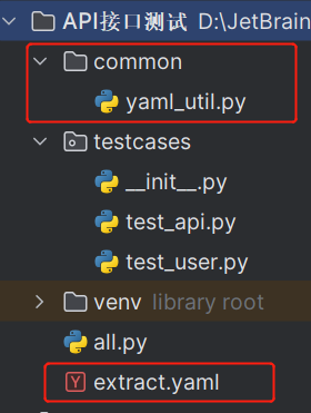 目录结构:#新增一个ymal空文件extract.yaml,使用yaml_util.py模块将test_api.py产生的全局变量access_token存储到extract.yaml,test_user.py在将extract.yaml中的内容提取使用