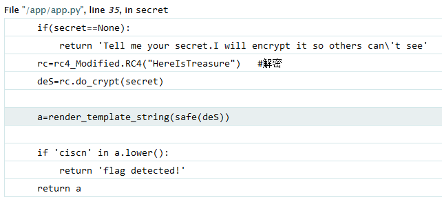 这里其实就是对我们输入参数的一个判断,首先判断你是不是为空,如果是空的参数,则返回一段话,就是我们刚进页面看到的内容,如果你传入了参数,那么它就会进行加密,可以看到是RC4加密,而且还泄露了密钥,密钥就是“HereIsTreasure”,而且通过报错,我们了解到这是flask的模板,而且python的版本是2.7的,那么我们可以利用flask的模板注入,执行命令,只不过需要进行RC4加密。RC4加密脚本: