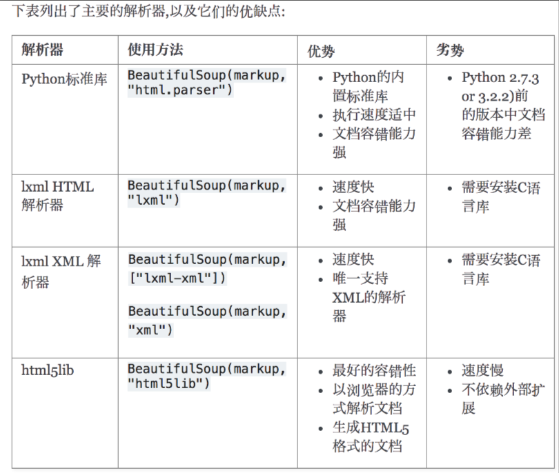 - Beautiful Soup支持Python标准库中的HTML解析器,还支持一些第三方的解析器