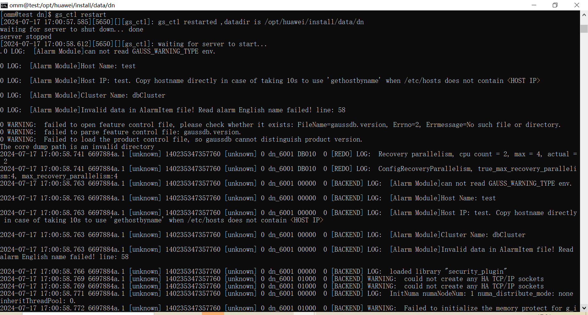 [omm@test ~]$ gs_om -t stop Stopping cluster. ========================================= Successfully stopped cluster. ========================================= End stop cluster. [omm@test ~]$ gs_om -t start Starting cluster. ========================================= [SUCCESS] test 2024-07-17 16:27:55.248 6697808b.1 [unknown] 140068131946560 [unknown] 0 dn_6001 01000 0 [BACKEND] WARNING: could not create any HA TCP/IP sockets 2024-07-17 16:27:55.248 6697808b.1 [unknown] 140068131946560 [unknown] 0 dn_6001 01000 0 [BACKEND] WARNING: could not create any HA TCP/IP sockets 2024-07-17 16:27:55.250 6697808b.1 [unknown] 140068131946560 [unknown] 0 dn_6001 01000 0 [BACKEND] WARNING: Failed to initialize the memory protect for g_instance.attr.attr_storage.cstore_buffers (1024 Mbytes) or shared memory (2174 Mbytes) is larger. ========================================= Successfully started. [omm@test ~]$ gs_om -t status ----------------------------------------------------------------------- cluster_name : dbCluster cluster_state : Normal redistributing : No ----------------------------------------------------------------------- [omm@test ~]$ gsql -d postgres -p 15400 gsql ((openGauss 5.0.2 build 48a25b11) compiled at 2024-05-14 10:26:01 commit 0 last mr ) Non-SSL connection (SSL connection is recommended when requiring high-security) Type "help" for help. openGauss=#