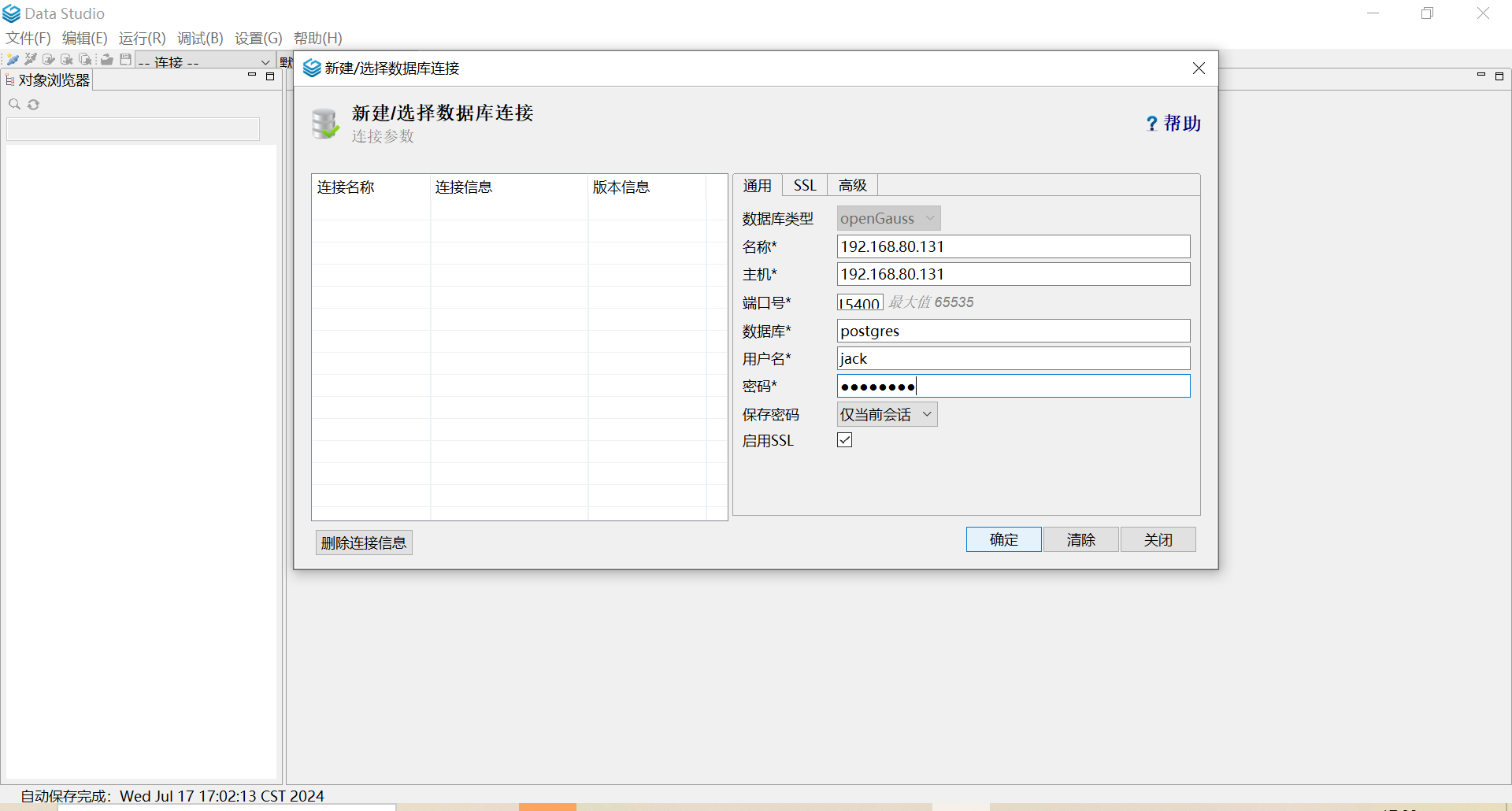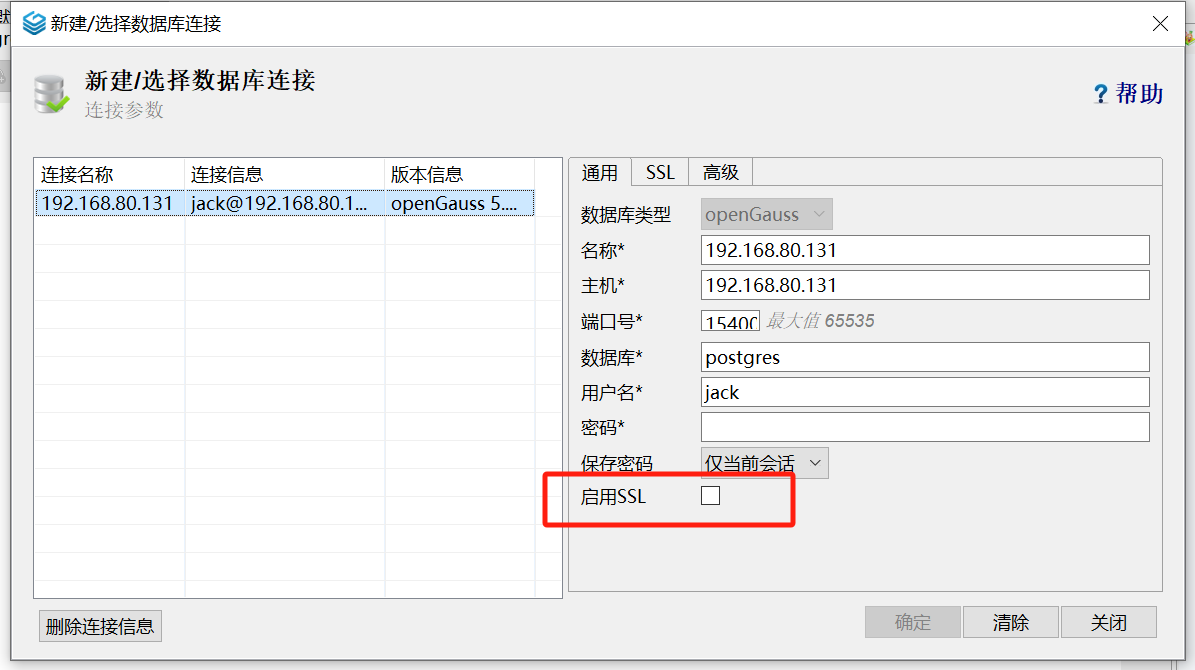 [omm@test ~]$ gsql -d postgres -p 15400 gsql ((openGauss 5.0.2 build 48a25b11) compiled at 2024-05-14 10:26:01 commit 0 last mr ) Non-SSL connection (SSL connection is recommended when requiring high-security) Type "help" for help. openGauss=# openGauss=# openGauss=# CREATE USER jack PASSWORD 'Test@123'; CREATE ROLE openGauss=# \q [omm@test ~]$ [omm@test ~]$ gs_guc set -N all -I all -h "host all jack 192.168.80.131/24 sha256" The gs_guc run with the following arguments: [gs_guc -N all -I all -h host all jack 192.168.80.131/24 sha256 set ]. Begin to perform the total nodes: 1. Popen count is 1, Popen success count is 1, Popen failure count is 0. Begin to perform gs_guc for datanodes. Command count is 1, Command success count is 1, Command failure count is 0. Total instances: 1. Failed instances: 0. ALL: Success to perform gs_guc! [omm@test ~]$