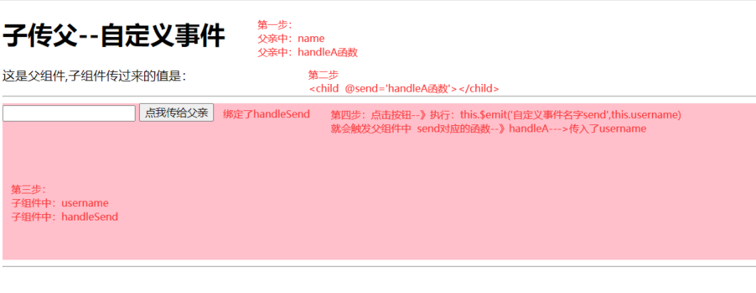 <input type="text" v-model="username"> <button @click="handleSend">点我传给父亲</button>