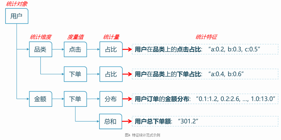 3)、按统计维度聚合(GROUP BY)。这是在对象聚合的基础上做的二次聚合。维度字段由配置给定,可以有多个字段,表示交叉特征统计,如不同时段的品类偏好,维度字段为:时段、品类。