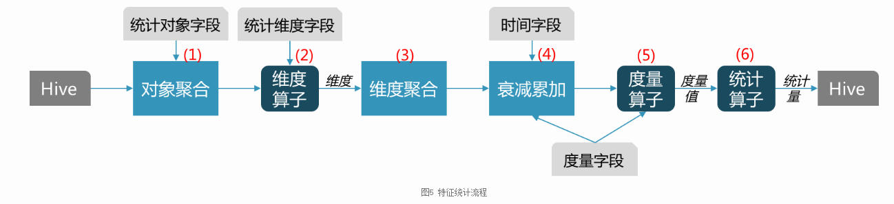 6)、计算统计量。经过对象和维度聚合后,对象、维度、度量值建立了二级映射关系:对象维度度量值,相当于一个二维Map:Map<对象, Map<维度, 度量值>>。统计量是对Map<维度, 度量值>做一个聚合操作。每个统计量对应输出Hive表中的一个字段。现在主要支持如下几种算子: