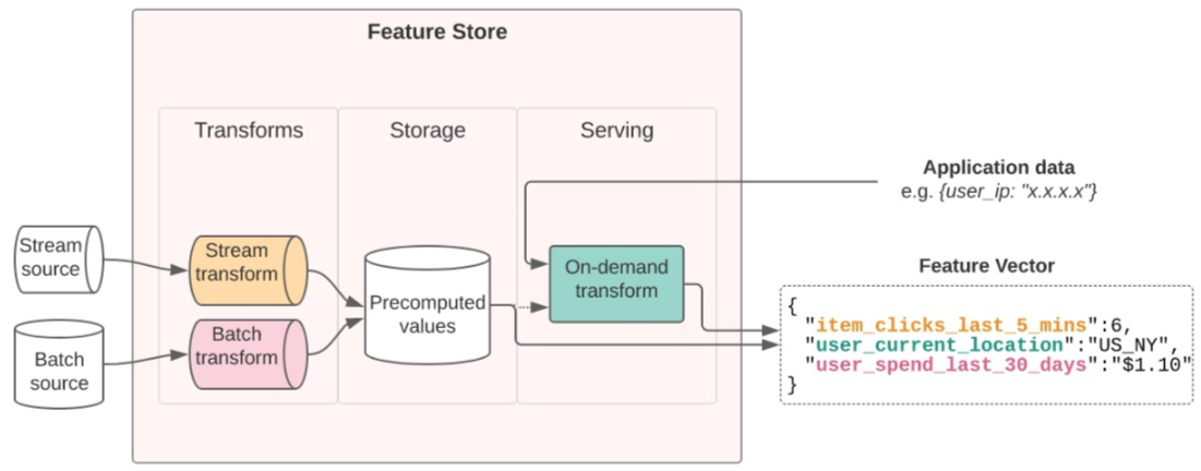 2、其次是服务(serving)的需求:这一层的核心需求是为线上服务提供高吞吐、低延迟的特征读取能力,而无需通过 SQL 去数据仓库读取。其它需求还包括:与已有的离线特征存储集成,使得特征能够从离线特征存储同步到在线特征存储(例如 Redis);实时的特征转换等。