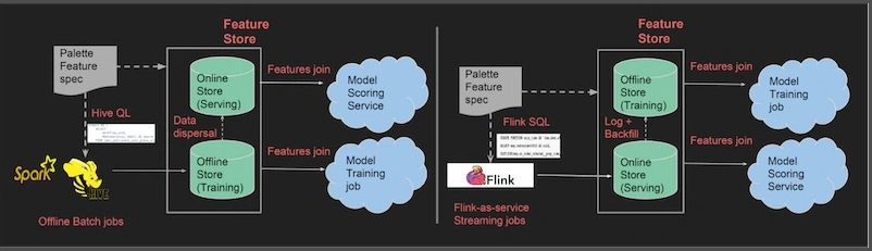 - 例如Michelangelo里offline存储使用了Hive,而online的存储利用了Cassandra的KV查询能力。