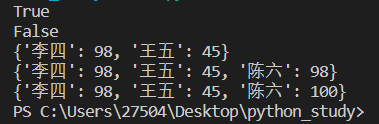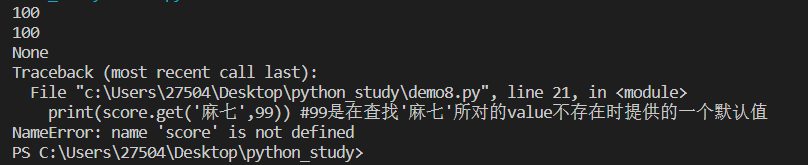 print(score.get('麻七',99)) #99是在查找'麻七'所对的value不存在时提供的一个默认值