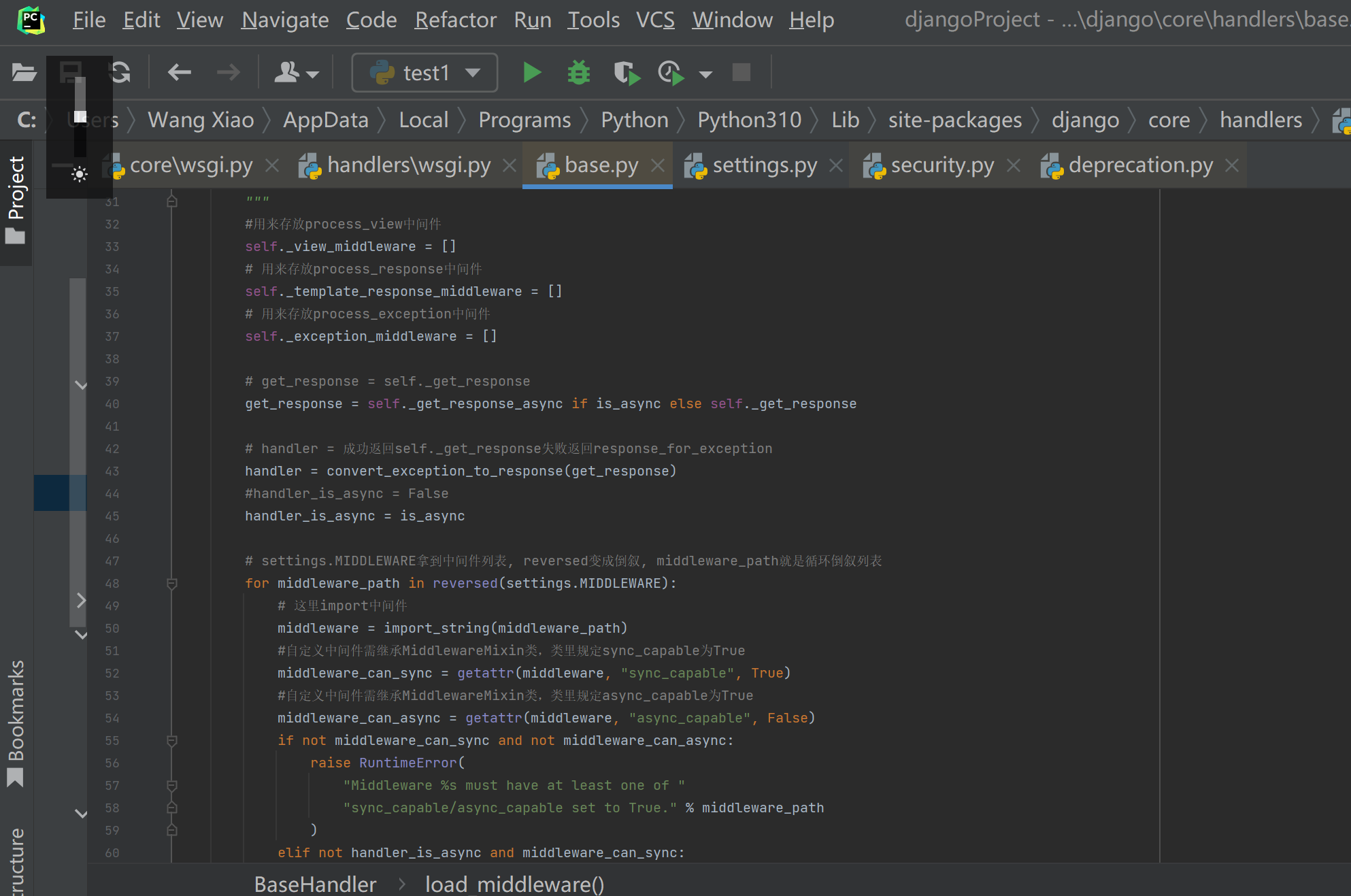 python内置函数warp: 不会改变函数结构, 防止函数的源数据丢失,如下图inner函数还会保存get_response的元数据 __name__ __doc__